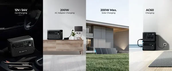 Multiple Recharging Options: Recharge it your way — via the AC60, solar panels, car cigarette lighter, or a dedicated adapter.