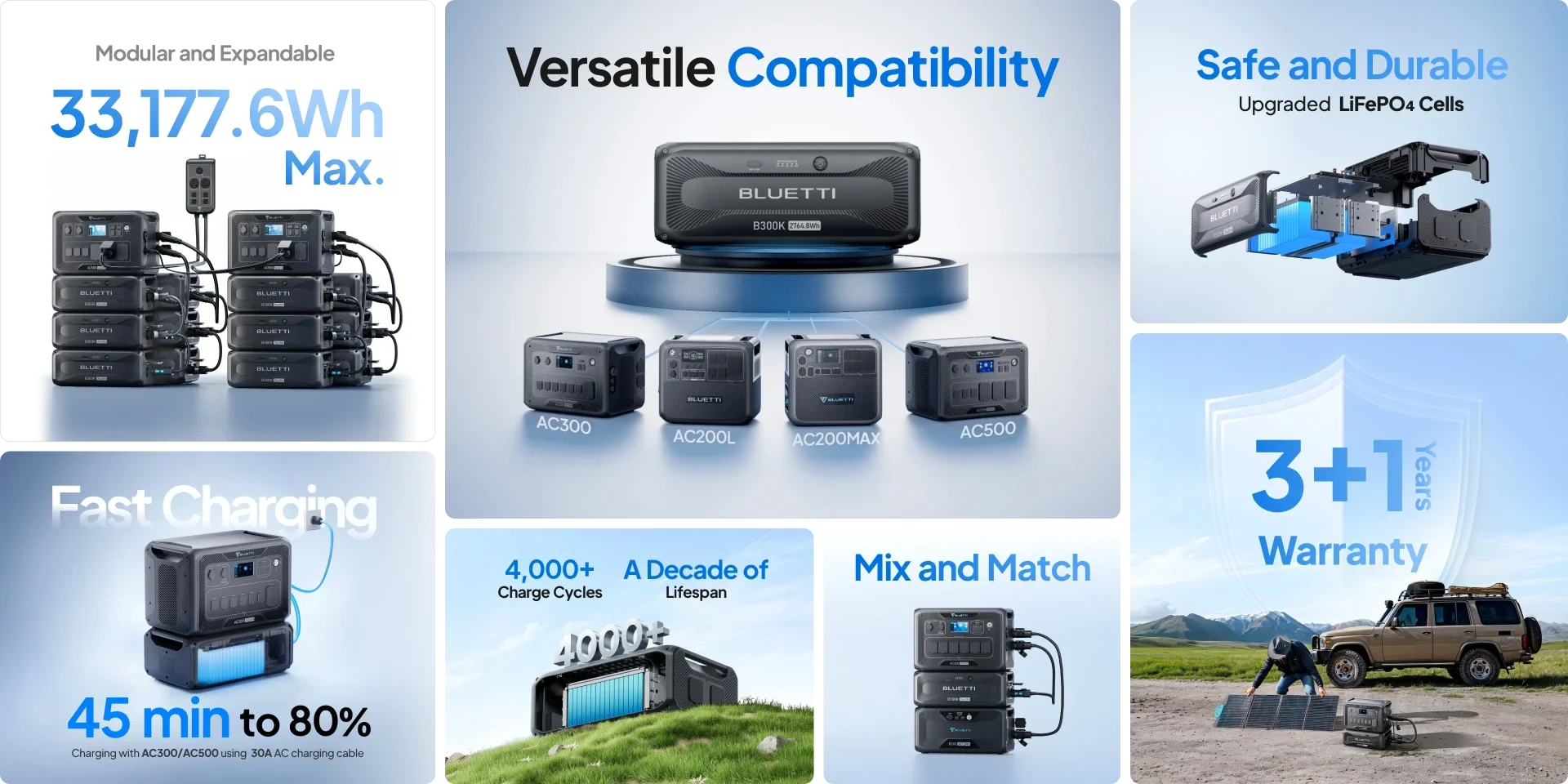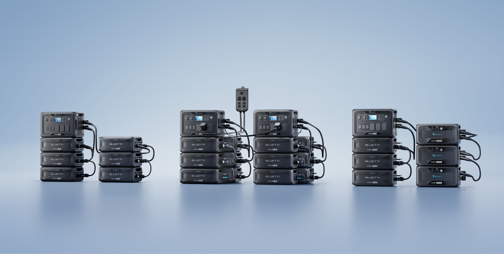 The B300K features a USB-A port for DC devices and needs to be paired with a power station to power AC devices. It can connect with different BLUETTI power stations like the AC200MAX, AC300, AC500, and AC200PL to expand their energy capacity.